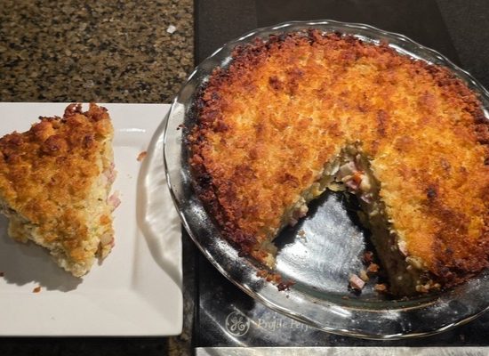 Ingredients 1 28 oz bag of Extra Crispy Tater Tots - completely thawed 4 tbsp of salted butter 1 tbsp cooking oil 1 cup of mixed shredded Monterey Jack and Cheddar cheese 1 cup of diced ham 1/3 cup of shredded Parmesan cheese 3 tbsp all purpose flour 3/4 cup whole milk 3/4 cup heavy cream 1/3 cup diced yellow onion 1/3 cup diced red bell pepper 1/3 cup diced green pepper 5 eggs 1 1/2 tsp salt 1 1/2 tsp blk pepper 1/4 teaspoon garlic powder 1/4 teaspoon Herbs de Provence 1/2 teaspoon Lawry's seasoned salt (if desired) Other Ingredients Aluminum foil Instructions For Tater Tot bottom crust: Preheat oven to 400 degrees. Separate