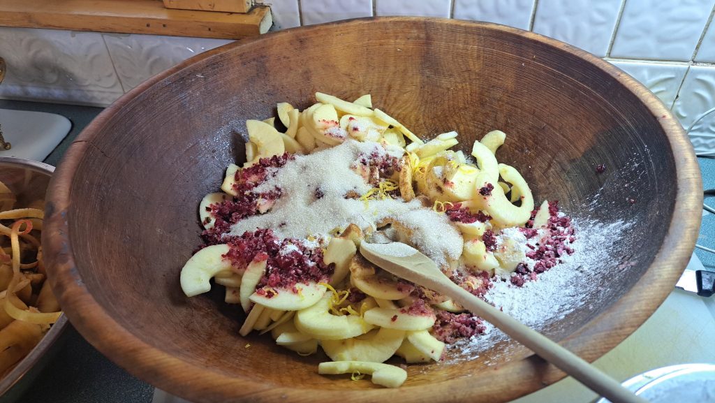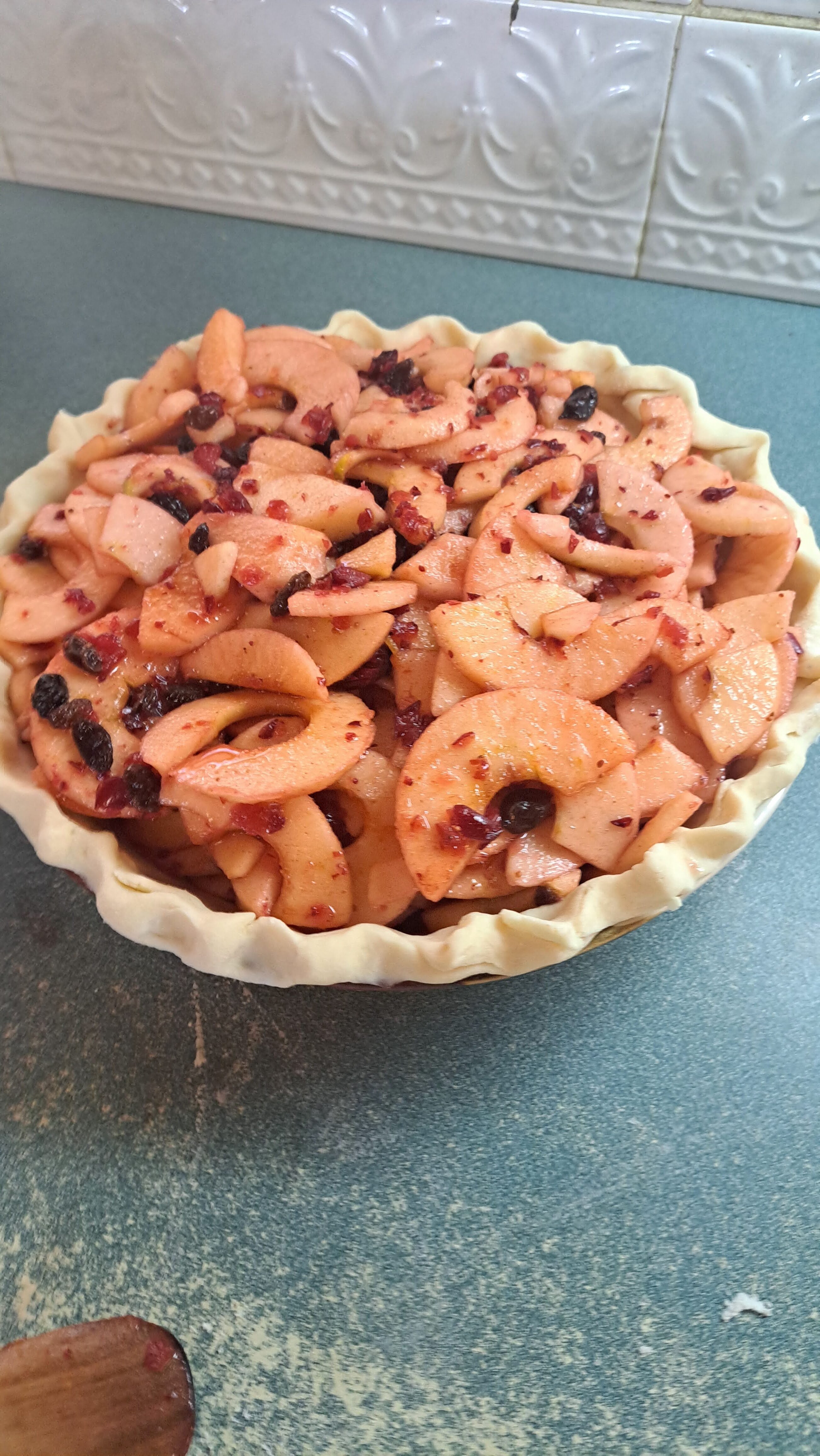 - Combine cranberries and ¼ cup sugar in a food processor. Pulse a few times until cranberries are coarsely chopped and combined with the sugar. Add mixture to the apples, along with the cornstarch, lemon peel, cinnamon, remaining sugar and raisins. Stir until thoroughly combined, then allow mixture to stand for an additional 15 minutes.