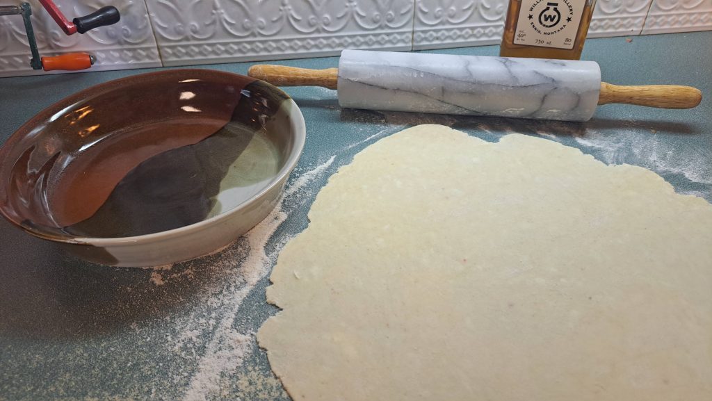 - If you have not already rolled out our pastry, roll it out on a lightly floured surface until it is ⅛-inch thick and will cover the bottom and edges of a 9-inch pie plate. Trim the edges of the crust to within ½- inch beyond the edge of the dish.